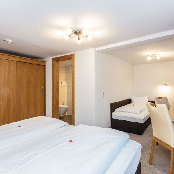 Our comfortable and spacious three-bedded rooms are equipped with cable TV, free W-LAN, radio, room safe, their own bathroom with shower/bath, WC and hair-dryer. The majority of the rooms have a sunny balcony. Whether buffet breakfast and/or half-board – enjoy that holiday ambience from the outset!